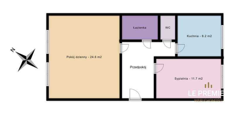 Całkowita powierzchnia mieszkania - 53,8 m2 składa się z oddzielnej kuchni - 8.2 m2 , pokoju dziennego - 24.6 m2 , sypialni - 11.7 m2 , piwnicy -5 m2